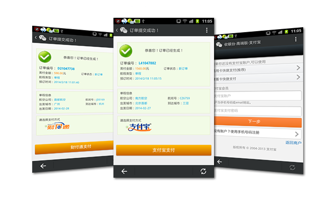 财付通\微支付\支付宝,需要客户申请财付通手机支付或微支付 | |