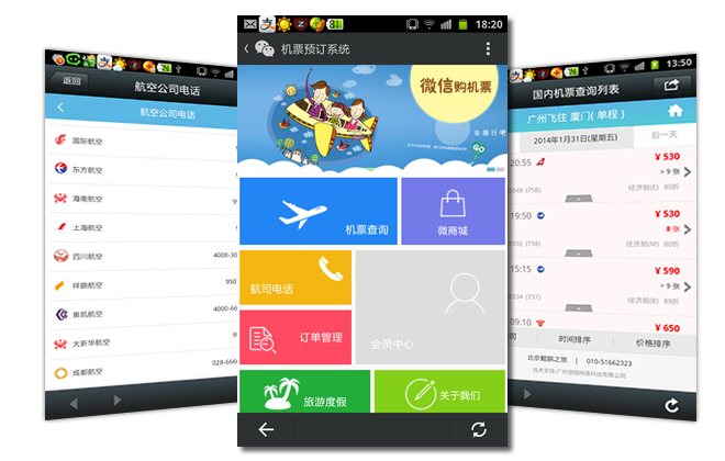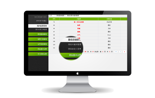 微信机票订单管理及微信营销管理平台,强大功能整合。可处理微信机票订单、设置关键词回复、自定义菜单、微活动设置、网站基础设置等功能。