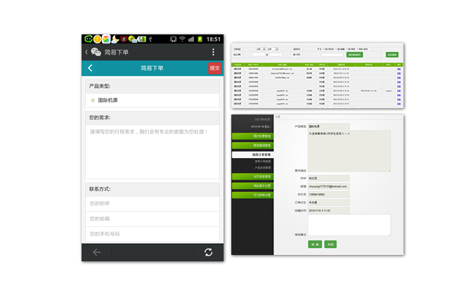 微信收单功能,可收集会员的行程需求(可定义收单栏目,如国际机票、签证等),客服人员后台处理与客户联系。微信管理后台处理 | |