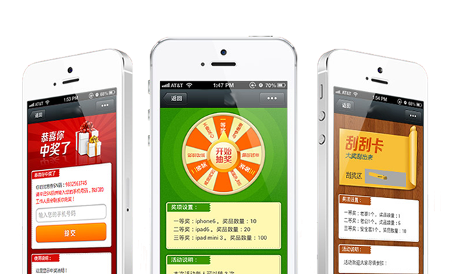 植入微信刮刮卡抽奖应用。可设置中奖概率及奖品等 | |