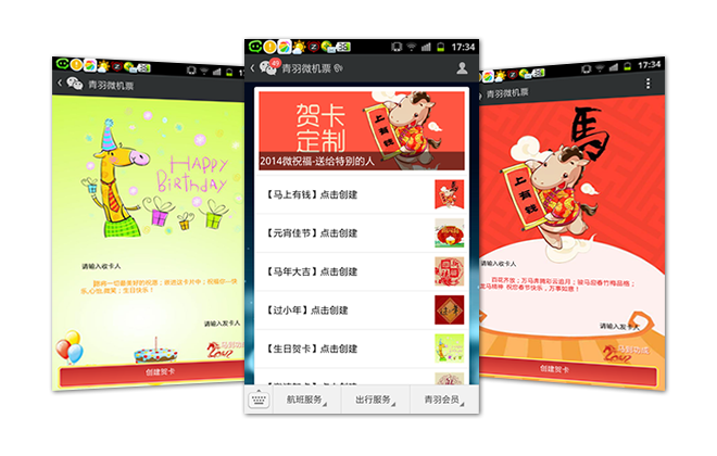 微信贺卡系统,您的粉丝可以通过微信将美图+妙文+个性签名发给自己的亲朋好友,并且收到的朋友也可以创建自己的贺卡再转发,实现层层转发的作用,转发的过程需要关注您的微信公众平台,从而吸引新的粉丝到您的微信公众平台.